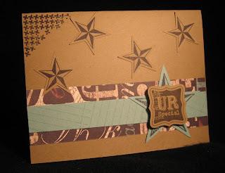 The paper packet is called Victory and features some masculine patterns. I think it will be perfect for a guy's card or layout. The stamps used come from the set that is part of the Workshop on the Go Kit. The square studs in the lower right corner and the hemp that goes around the card also come with the Kit. The only item that comes from my stash is the wooden designer button. Don't you love Workshop on the Go Kit? A little kit has everything you need!